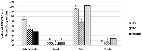 Phytochemical content of Tuckeroo whole fruits and its components. The vertical bars represent standard deviation (n = 3). Different superscript letters on top of each type of column indicate significant differences (p < 0.05).