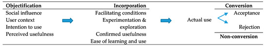 STAM is a model that includes both acceptance and adoption factors. However, STAM does not include attitude as an independent variable [27]. While the objectification phase refers to the role the technology will play, the incorporation phase refers to the interaction with the technology [27].