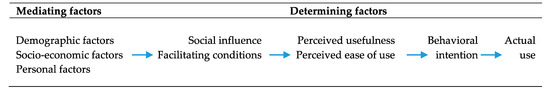 Renaud and Van Biljon talk about another developed model, namely the unified theory of acceptance and use of technology (UTAUT), which distinguishes between the factors determining use behavior (the constructs of performance expectancy, effort expectancy, social influence and facilitating conditions) and the factors mediating the impact of these variables (gender, age, experience, and voluntariness) [27].