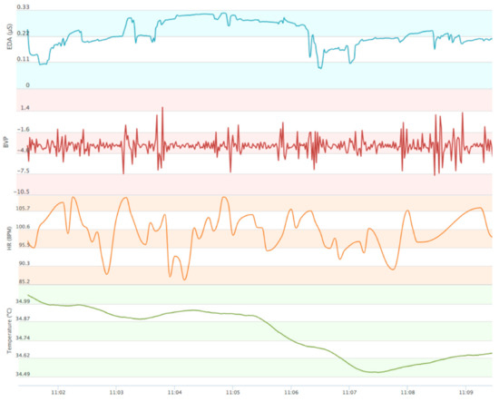 Two case studies were carried out at two different industrial environments (two companies) with five different operators. The aim was to assess how operators and company representatives perceived the output data and to investigate how physiological data could be presented. Two data types, EDA and Blood Volume Pulse (BVP), were analysed by studying the output graphs with the participants; Figure 3 depicts an example graph.