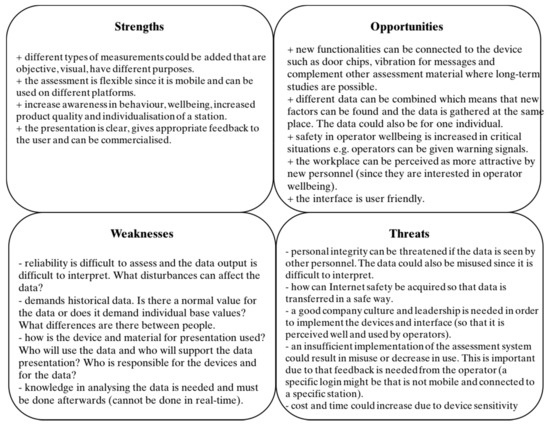 Workshop participants identified risks and possibilities with the prototype, using a SWOT analysis (assessing EDA, BVP, HRV, temperature and four environmental data). The main identified risks were that the data was difficult to interpret and that there could be issues regarding personal integrity that need to be considered, e.g., who should have access to the data and who should interpret it. For instance, the assessments could be given to the company doctor (or similar) and not directly to the team leader. The possibilities were that the prototype was flexible, mobile-based and could be connected to many data types. It was considered to be the first step towards an increased awareness in operator wellbeing at the workplace. The results are presented in Figure 5.