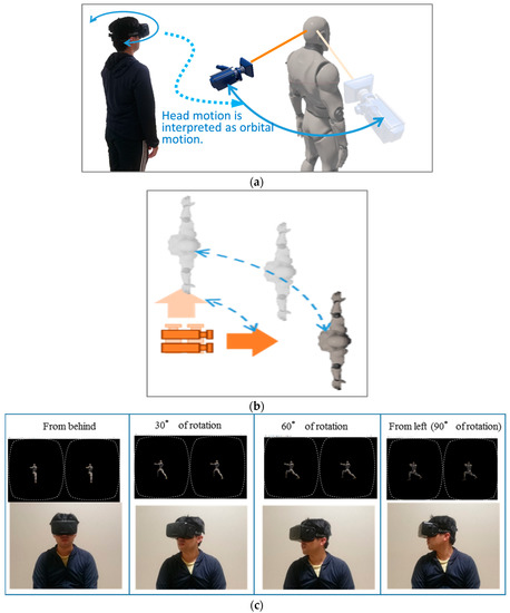 This section describes our system for improving the performance of vision-based pose-perceptual characteristics using an HMD (Oculus Rift DK2, Oculus VR, Inc., Irvine, CA, USA). The system is employed to associate the stereo HMD view with the learner’s head-rotation, which is measured by HMD-embedded inertial sensors. It is called “Head Motion-Associated virtual stereo Rearview” (HMAR) in this paper, and is explained in detail in the following. The virtual two cameras are assumed to be a stereo camera in one united body, and to be at the point of several tens of centimeters away from the back of the learner’s head. The learner’s head rotation is measured by HMD-embedded inertial sensors, and, based on the measurement, the virtual stereo rearview of a reference avatar is synthesized in a computer graphics (CG) way by using a software, Unreal Engine 4 (Epic Games, Inc., Raleigh, NC, USA), and the virtual stereo rearview is displayed in the HMD. Some examples of the presented virtual stereo rearview are shown in Figure 1c. Camporesi et al. showed that the use of avatars and user-perspective stereo vision improved the quality of produced motions and the resemblance of replicated motions [15]. Yu et al. used two different tasks. One task was related to object-centered 3-D transformation such as mental rotation, and the other task was related to perspective transformations in which people adopt the egocentric perspective of another person. As a result, similar to Camporesi et al., they suggested that observers were particularly sensitive to the presence of a human head and body in comparison with the other block and teapot figures, and that these human body features allowed observers to quickly recognize and encode the spatial configuration of a figure [16].