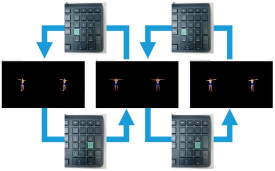 - Key-Switched virtual stereo Rearview (KSR): One of the eight discrete views that were taken from the eight viewpoints at 45° intervals in 360° around the target avatar and displayed in the HMD. It was switched on after the other upon a subject’s key-pressing operation, as shown in Figure 2. This instructional mode is regarded as the most representative ordinary method.