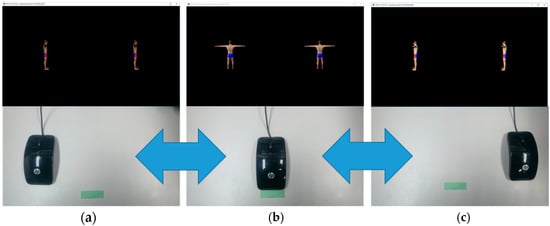 Figure 3. Mouse-associated virtual stereo rearview (MAR): In the case where the mouse is dragged toward the right, the avatar displayed in HMD is rotated in the counter clockwise (CCW) direction around the avatar trunk axis (e.g., from (b) to (c) in Figure 3). In the other case where the mouse is dragged toward the left, the avatar displayed in HMD is rotated in the clockwise (CW) direction around the avatar trunk axis (e.g., from (b) to (a) in Figure 3).