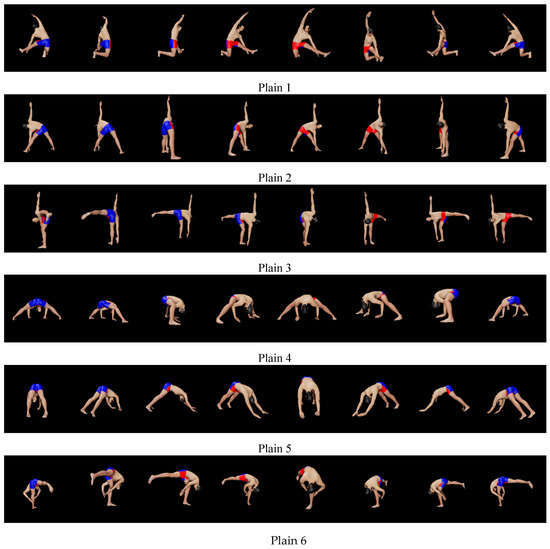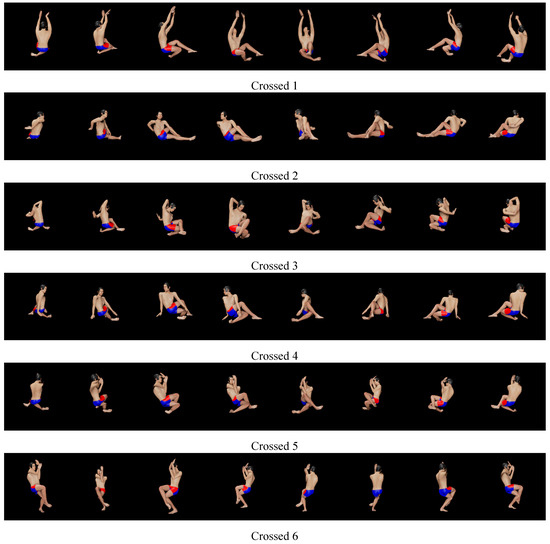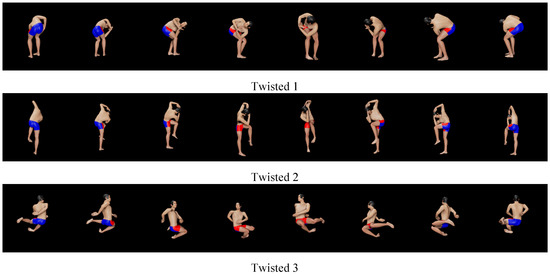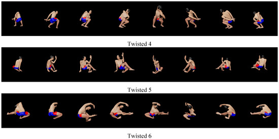 Figure 5. Six twisted poses. - Crossed poses (see Figure 6): Some of the avatar’s limbs are crossed. It is also considered to be necessary to look at the avatar from multiple directions in order to recognize the poses, as in the twisted poses. In addition, positional relationships between limbs should be studied further.