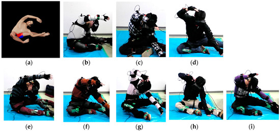 A presented pose and its reproduced poses: (a) Presented; (b–l) successfully reproduced; (m) left and right reversed.