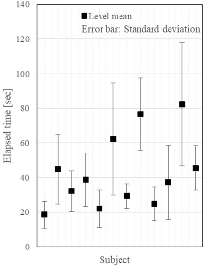 Figure 7 shows an example of the presented pose (Figure 7a) and the reproduced poses by 12 subjects (Figure 7b–m). As shown in Figure 7m, though a rare case, subjects sometimes took left-and-right reversed poses in pose reproduction. The causes of the pose-reproduction failure were due to misperception and forgetfulness. The misperception-related failures are the left-and-right and front-and-back reversions in the crossed poses, and the clockwise-and-counterclockwise reversions in the twisted poses. The ratio of the reproduction failure due to forgetfulness was about four percent, and that due to misperception was six percent. However, there was no significant difference between them as a result of a statistical test on the ratio difference. Next, the failure occurrences due to misperception were very few, and the number of failures was only 2, 1, and 1 for the HMAR, MAR, and KSR, respectively. Therefore, we were not able to confirm significant differences between them as a result of the same statistical test as described above. In the time-consuming conditions presented in this work, it is considered difficult to make the differences obvious, but we could not deny the possibility of finding a difference by conducting many large sample size experiments. Thus, since such pose-reproduction failures rarely occurred, we shall examine the elapsed time in the following. It is considered that, regardless of whether there are failures in pose reproductions or not, the reproduction processes will be similar. Therefore, there would be no appreciate differences between the elapsed time with-failure and that without-failure, and the elapsed time data with failure as well as without failure were also applied to the analysis.