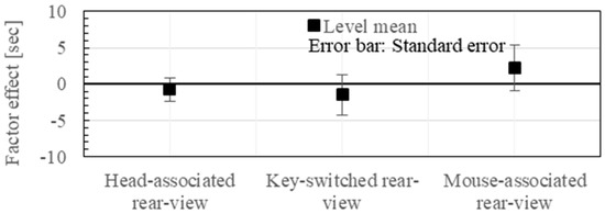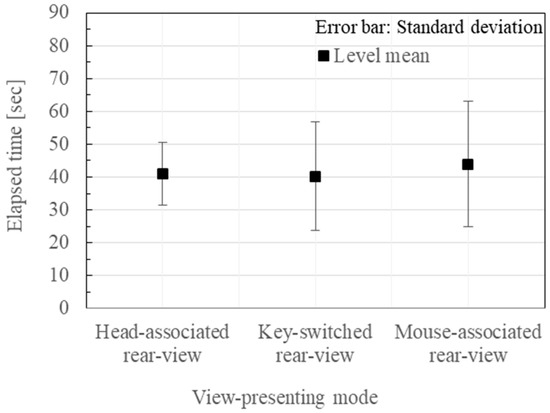 The authors have applied some statistical tests to the experimental results of Figure 11. As a result of the t-test with the Bonferroni multiple-comparison correction, there were no significant differences among the population means of the three view-presenting modes. However, as a result of the F-test with the Bonferroni multiple-comparison correction, the variance of the Head Motion-Associated virtual stereo Rearview (HMAR) was significantly smaller in comparison to either the key-switched rearview (KSR) or the mouse-associated rearview (MAR) under the significant level of 0.1%: the test statistics of F = 4.00 and 2.93 for KSR and MAR, respectively. Generally speaking, worse cases sometimes result in fatal results, and the stability that is represented by the variance is principally one of the important performance indices. Considering this principle, the significant difference with respect to the variance shows an advantage of the HMAR mode.