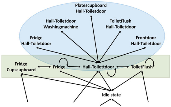 An example part of the MM can be seen in Figure 1. It includes the states (green rectangle) derived from the data stream example above and an additional part (blue rounded mark) to show one MM-structure. Such a structure is a temporal correlation of sensor events, which is separated from the rest of the MM and thus represents a human habit. Most structures that can be found in such an MM are formed as stars: one MM-state is the start and end point for most connected paths. A more detailed description of all possible structures can be found in a former publication [23]. The structures are detected during the training phase. The first step of training is to read the off-line sensor data. Given the MM-state definition and the fact that reading the measurements equals an ordered event stream, structures can be found while importing the offline training data. For example, all paths (circles) starting at MM-State #1 and leading back to MM-State #1 are considered to be one structure. More detailed information about the structures and their detection can be found in a former publication [23]. The training data are countable finite. Only a representative amount of sensor combinations is contained. During the ADL-recognition phase, not yet learned combinations can occur, but still must be recognized. Therefore, the training result must be flexible (uncertain) enough to recognize similarities. This is achieved by using a probability distribution function of sensors influencing the ADL detection, which is explained in the next sections.