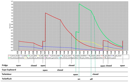 The influence of the human memory capacity of the hfci can be seen at 11:44 a.m. The cupboard was already closed at 11:39 a.m., but the memory kept this event in mind by a slow decrease of the function curve. The next event assigned to the ADL take drink (red curve) is added to a higher current value than is the case with the ADL eating (blue curve). Thus, the more dominant ADL between these two is still the ADL take drink. Furthermore, a new sensor event Fridge “on” occurred at 11:44 a.m., which is equally distributed to both ADL eating and take drink. This memory capability can also be misinterpreted. At 11:44 a.m., the ADL use toilet and take shower are still higher than the curves assigned to the current event red and blue (ADL take drink and eating); also, all sensors for the ADL use toilet and take shower are already deactivated. Therefore, the detection of the current executed ADL can be delayed due to the memory capability of the hfci. This problem will be addressed in the next Section 6.