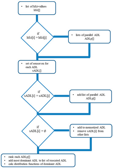 Second, for each ADL, the set of sensors “on” is calculated. If sets of sensors are disjoint, these ADL are executed in parallel. If there is an ADL where the set of sensors is empty, but the hfci is positive, this ADL was the recent executed ADL. This one is still in the algorithm’s memory and can become an interrupted (nested) ADL if a sensor event assigned to this memorized ADL occurs next. Following these rules, a probability distribution is calculated including parallel and nested ADL by dividing the hfci-value by the sum of all hfci-values. Parallel ADL obtains the same probability as the ADL where parallelism was detected. If two ADL have a very similar probability, then two cases are possible: first, these ADL could be interpreted as parallel or, second, it is not possible for the algorithm to decide more precisely which of the two ADL is the most dominant, and additional information may be needed.