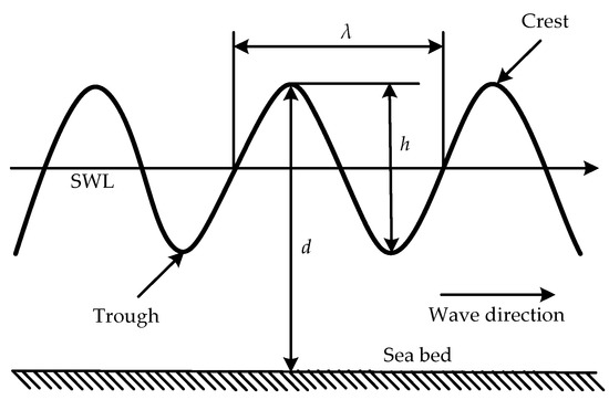 Ocean waves are generated by wind or storm striking to the sea surface very far from seashore or by locally generated winds. This wind strike creates swells of water that reach towards coastal line in the form of waves. Many water wave theories have been proposed to study the characteristics of ocean waves [24,25]. As shown in Figure 2, the upper peak of wave is called crest while the lower peak as trough. The wave height (h) is the distance from crest to trough. The wavelength (λ) is the length between two consecutive troughs or crests whereas the sea depth (d) is the distance from sea bottom to still water level (SWL).