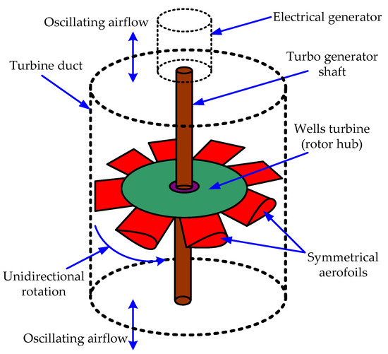 The Wells turbine has the input as air flow inside the OWC chamber that creates oscillatory pressure drop across the turbine rotor as shown in Figure 3. The wells turbine is designed in such a way that it converts bidirectional air flow into unidirectional rotatory motion which drives the generator [26,27,28,29].