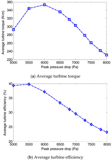 For uncontrolled case, variations in average turbine torque ( T t ¯ ) for various pressure amplitudes can be seen in Figure 5a. As observed, average torque increases in low pressure regime but for higher pressure range, it rolls down due to stalling of turbine. The mean efficiency [29] of the turbine ( η ¯ t ) can be written as: