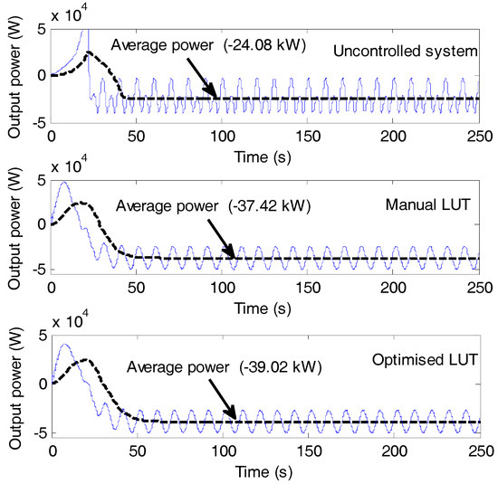 Now, the effectiveness of the proposed MPPT algorithm with optimised LUT for maximizing the turbine efficiency and electrical output power is studied. Simulation results are given in Table 4 wherein the flow coefficient is completely bounded within ϕ ≤ 0.3 and the turbine efficiency and output power has enhanced to more higher values than it was with manual LUT. A comparative analysis of output power for manual and optimised LUT is also shown in Figure 7. The overall power extraction for dP = |7000 sin (0.314t)| Pa is provided in Table 5 wherein the power loss across Rext is also taken into account. In this situation as well the optimised LUT approach provides better results than the uncontrolled and manual LUT.
