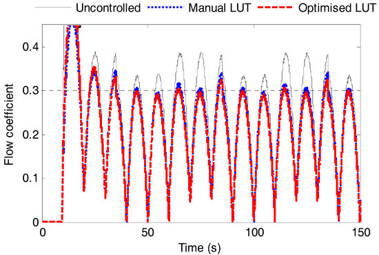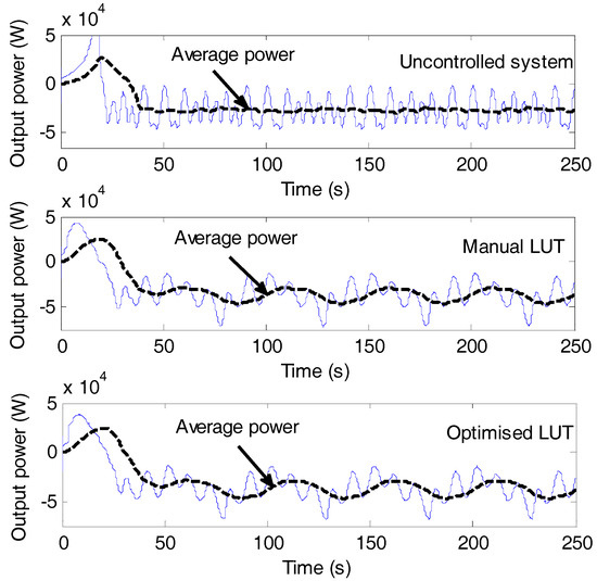 The main challenge of the proposed control is to test the impact of real sea waves on the plant performance. Therefore, an irregular pressure waveform as shown in Figure 11 has been considered for validation of proposed MPPT algorithm. The corresponding variation in flow coefficient is shown in Figure 12. It can be observed that ϕmax remains below 0.3 for optimised LUT whereas it exceeds for uncontrolled case and manual LUT. The output power for stalling phenomenon (without control), manual LUT and optimised LUT based MPPT algorithm is depicted in Figure 13. The output power waveform has been enhanced with optimised LUT as compared to uncontrolled system and manual LUT.