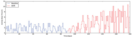 In a second development phase, to have custom data including a behavior drift we chose to use a simulator. The data were generated using SHARON [40], enabling us to maintain the ARAS dataset environment (house, sensors, etc.). Two datasets of approximately three months each were generated, including the domestic activity of a person living alone as detected by the set of virtual sensors. While the first dataset comprises the normal routine, the second contains the behavioral drift which could be generated by the occurrence of AD [38]. In particular, the simulated symptoms comprise an erratic sleep pattern, an increased duration of complex activities (e.g., having a shower, meals, etc.) and an anomalous augmentation of passive activities (e.g., watching TV, relaxing, etc.).