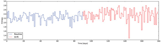 Entropy can be applied not only to a single sensor, but also to the whole house at once, analyzing not a single aspect but the overall activity of the full set of sensors. In detail, building a vectorial binary variable out the instantaneous sensors statuses, and conveniently converting such binary “word” to a decimal number, it is possible to compute its Entropy. The Entropy of such a variable can be computed with a formula similar to Equation (1) considering all the possible decimal values corresponding to the original binary statuses: