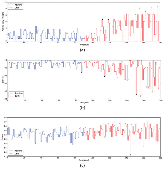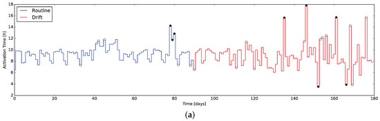 - Masciadri, A.; Trofimova, A.A.; Matteucci, M.; Salice, F. Human Behavior Drift Detection in a Smart Home Environment. Stud. Health Technol. Inform. 2017, 242, 199–203. [Google Scholar] [PubMed]