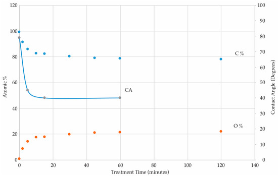 The materials, and surface characterization using X-ray photoelectron spectroscopy (XPS), water contact angle (CA), and Atomic Force Microscopy (AFM) measurements to determine surface composition of the top 2–5 nm, increases in hydrophilicity, and changes in surface roughness, respectively, were conducted as a function of treatment time, as described in ref. [4]. Commercially available 0.125 mm thick biaxially oriented PS film (Goodfellow Corp., Huntington, UK), (C8H8)n, was cleaned with KOPTEC 200 proof (100%) anhydrous ethanol (Decon Labs Inc., King of Prussia, PA) in an ultrasonic bath for 15 min and stored in a desiccator, that contained calcium sulfate, for at least 24 h.