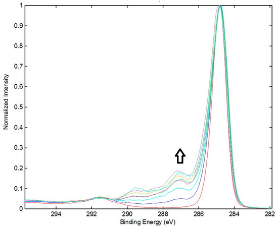 Overlapped C 1s spectra for control and treated polystyrene films for 0, 2, 5, 10, 15, 30, 45, 60 and 120 min using a remote MW discharge of Ar/O2 mixture. The arrow indicates increasing treatment time.