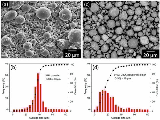 Powder morphology and particle size distribution for: (a,b) as-atomized pure 316L powder and (c,d) 316L/CeO2 powder mixture ball milled for 2 h.