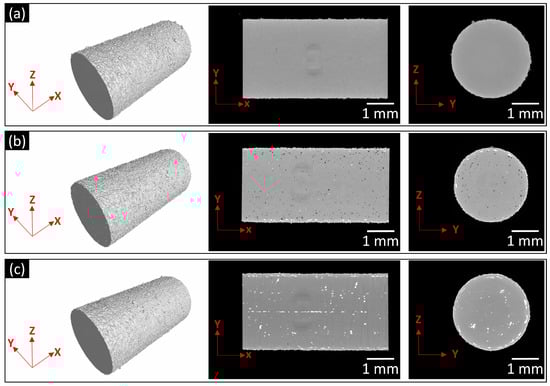 XCT images for: (a) an unreinforced 316L specimen synthesized by SLM with a scanning speed of 688 mm/s, (b) a 316L/CeO2 composite synthesized at 350 mm/s, and (c) a 316L/CeO2 composite synthesized at 488 mm/s. Note that the other processing parameters have been kept constant. The small bright particles in (b) and (c) are CeO2 and the black dots in (b) are porosity.