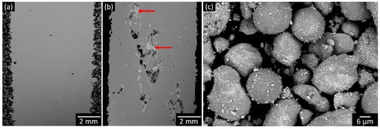 SEM micrographs for: (a) an unreinforced 316L specimen synthesized by SLM at 688 mm/s; (b) a 316L/CeO2 composite synthesized at 688 mm/s; and (c) 316L/CeO2 powder mixture ball milled for 2 h. The bright contrast indicated by red arrows in (b) and the small bright particles adhering to the large 316L particles in (c) are the CeO2 phase.