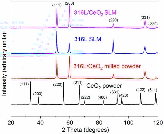 Both the unreinforced 316L matrix and 316L/CeO2 composite consist of a single-phase austenite structure (Figure 4). The CeO2 phase cannot be detected in all XRD patterns. This can be due to the melting and dissolution of the CeO2 phase during SLM or because the small amount of reinforcement is below the detection limit of the instrument. The latter possibility is corroborated by the fact that no diffraction peaks of the CeO2 phase are detected in the 316L/CeO2 milled powder. In addition, the CeO2 particles are visible in the XCT image in Figure 2c, further supporting that the CeO2 phase is not melted during the process. Because XCT analysis was carried out using a voxel size of 5 μm, which sets the lowest limit for the detection of the second phase, it is surprising to observe the CeO2 particles considering their small starting size (0.5–1 µm). The CeO2 particles must, therefore, have been clustered during SLM processing to a size suitable for XCT analysis. This hypothesis is corroborated by the SEM micrographs shown in Figure 5: CeO2 particles with size in the range of 30–200 µm are indeed formed in the 316L/CeO2 composite.