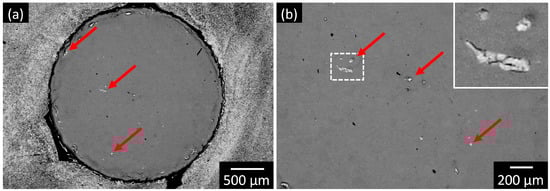 SEM micrographs for the 316L/CeO2 composite synthesized by SLM at 488 mm/s: (a) overview showing the distribution of the CeO2 particles; (b) view at higher magnification revealing that clustering of the CeO2 particles occurs during SLM (see also the inset corresponding to the dashed box in (b)). The red arrows indicate the position of the CeO2 particles.