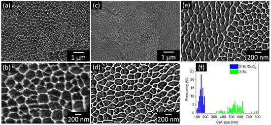 Due to the high cooling rate characterizing materials processing by SLM (103–106 K/s), metastable phases and microstructures can be formed [,,]. The present unreinforced 316L specimen displays a fine cellular microstructure (Figure 6a,b), in agreement with previous reports on 316L fabricated by SLM [,,]. The addition of the CeO2 reinforcement does not affect the formation of the cellular microstructure (Figure 6c–e); however, the CeO2 phase induces significant microstructural refinement and decreases the cell size in the composite material with respect to the unreinforced matrix, as demonstrated by the cell size distributions shown in Figure 6f.