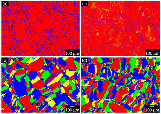 EBSD analysis for: (a,b) an unreinforced SLM 316L specimen synthesized at 688 mm/s and (c,d) a SLM 316L/CeO2 composite processed at 488 mm/s. The small yellow particles in (c) are CeO2.