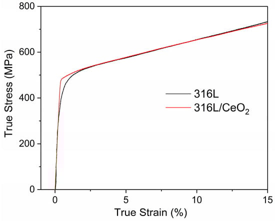 Grain refinement occurs at a larger length scale as well. EBSD analysis reveals that the average grain size (calculated over more than 2300 grains) of the unreinforced 316L (45 ± 3 µm) is reduced in the 316L/CeO2 composite to about 25 ± 2 µm (Figure 7). The CeO2 particles are thus effective grain refiners, acting as heterogeneous nucleation sites and hindering the growth of both cells and grains []. The reduced grain size cannot be attributed to the reduced scanning speed used in the 316L/CeO2 composite with respect to the unreinforced 316L. Slower scanning speed would increase the depth and volume of the molten pool, consequently raising the temperature and increasing the time needed for solidification. This, in turn, would give the grains more time to grow, leading to microstructural coarsening rather than refining, in agreement with the work of Dutta Majumdar et al. [], who observed the decrease of the grain size with increasing scanning speed in 316L steel processed by laser assisted rapid fabrication. The addition of the CeO2 reinforcement has a significant influence on the yield strength (0.2% offset), which increases from 412 ± 7 MPa for the unreinforced 316L to 485 ± 4 MPa for the 316L/CeO2 composite while retaining appreciable plastic deformation (Figure 8). The observed increase of strength can be ascribed to the load bearing capacity of the CeO2 reinforcement [] along with the Hall–Petch strengthening contribution resulting from structural refinement [].