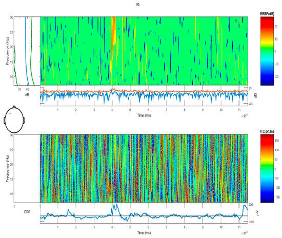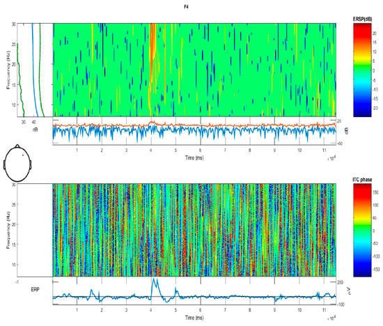 The raw data were analyzed with the EEGLab software [29], filtering out noises from blinking. Figure 6 and Figure 7 shows the brain activity, in a range from 7 Hz to 30 Hz—from alpha to beta (Bootstrap Method, 0.1%). In the figures, ERSP means Event-related spectral perturbation, ITC means Inter-trial coherence and ERP means Event-Related Potential.