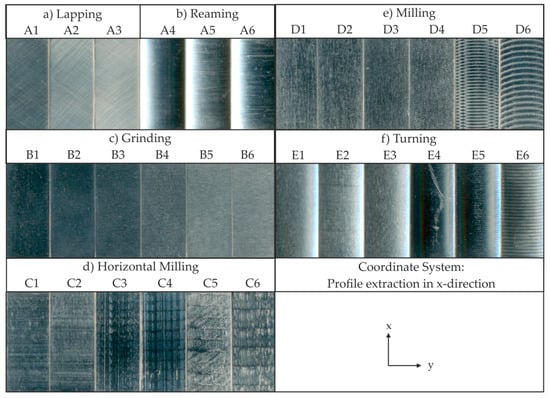 In order to test the model with a broad range of different surfaces, the roughness specimens set Rubert 130 was chosen, which features typical engineering surfaces and represents the most relevant manufacturing principles: Turning, Milling, Horizontal Milling, Grinding, Lapping and Reaming []. The different manufacturing principles are given in varying degrees of roughness, leading to a total number of 30 different rough surfaces (see []) from six classes. All 30 samples and their nomenclature are shown in Figure 2 and were measured with a stylus instrument (Hommel Nanoscan) with a 5 µm stylus tip. The measured dataset was filtered and examined with the ARMAsel algorithm by Broersen [,,,]. The required ARMAsel algorithms and their implementation are available within the ARMASA-toolbox for MatLab [].