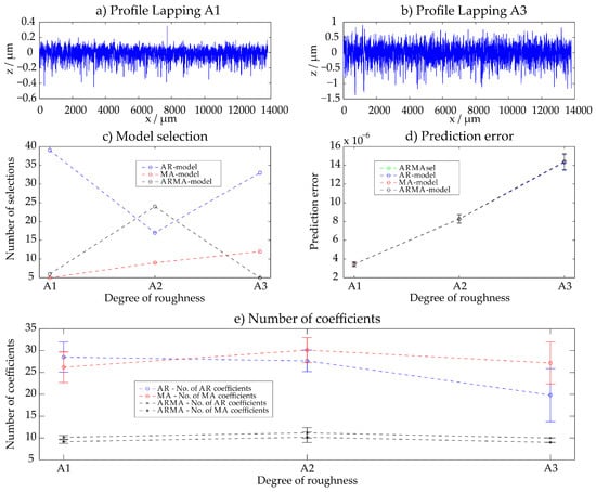 The three different lapped surfaces shown in Figure 2 were evaluated with the ARMAsel algorithm. The surface Lapping A1 is the finest surface, whereas the surface Lapping A3 is the one with the biggest roughness (Figure 3a,b). The results for the selected models with the smallest prediction error (Figure 3c), the absolute values of the prediction errors (Figure 3d) for the selected models and for the best AR-, MA- and ARMA-models are given in Figure 3 as well as the selected number of parameters for each model category (Figure 3e). There, the model selection of the profiles A1–A3 is indicated as well as the prediction error of the varying time series models. All results are presented as mean value and standard deviation of all evaluations of the 50 evaluation areas which feature a length of 4 mm each and thus cover the whole measuring length of approximately 14 mm. The results show that AR-, MA- and ARMA-models are suitable for a description of lapped surface roughness and feature similar values of the prediction error. For the description of the fine roughness, the AR-model is the model which is chosen the most often. Figure 3 illustrates the whole measuring length of the profiles Lapping A1 and Lapping A3 and displays the according results of the different time series models for all 50 evaluations of each sample.