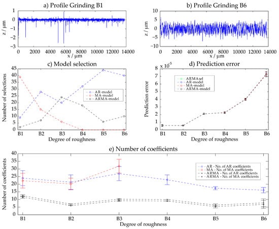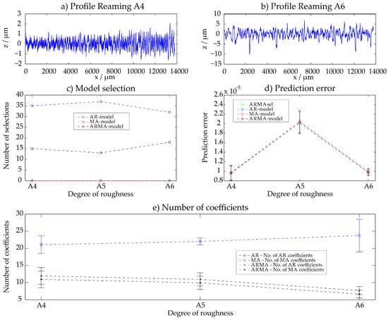 For the examination, 50 different evaluation positions on each of the 30 samples with a lateral distance of 200 µm to each other and an evaluation length of 4 mm were considered and used as input data of the ARMAsel algorithm. For the evaluation, the selection of the best model, the prediction errors of the best AR-, MA- and ARMA-model and the chosen number of AR- and MA-coefficients were considered. Thus, the result for each sample A1–E6 are the 50 chosen models for all 4 mm evaluation profiles, the prediction error for the varying time series models and the according AR-, MA- or ARMA-coefficients for each evaluation. Due to the filtering process before the evaluation with the ARMAsel-algorithm, waviness components are removed from the measured dataset and are not modeled with the stochastic models. The default filter wavelength is chosen to . For some rough structures that have characteristic long-wave machining marks based on the feed-rate, the filter wavelength is adjusted so that the features which are characteristic for the considered manufacturing process are not removed from the dataset (this affects the profiles C3–C6 and D6).