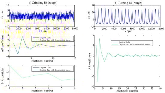 In order to examine the quality of the calculated models, different criteria are suggested. As a first quality indication, the stability of the calculated coefficients is determined. In doing so, the values of the AR- and MA-coefficients are analyzed. These coefficients are determined for a selected profile. Then, this profile is superposed with a long-wave sinusoidal structure that features a wavelength of 8 mm and the values of the coefficients are determined once more. When the coefficients are compared, the robustness of the model can be evaluated. If the two sets of coefficients are in good agreement, the model is robust. When the coefficients differ significantly, the model is not robust as small form distortions should only change the coefficients with a low index. Figure 6 illustrates the comparison for a stochastic ground surface (B6) and a more deterministic turned surface (E6). The coefficients are determined before and after adding the sinusoidal wave. This is done to characterize the effect of the deterministic structure on the model. An exemplified evaluation of one 4 mm extract of the measured profile is illustrated in Figure 6 for the profiles B6 and E6.