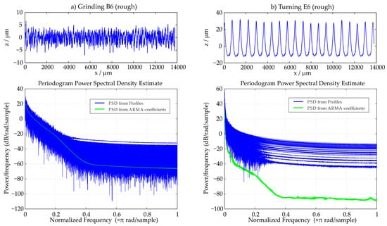 Based on the PSD of a surface, for example also its ACF can be calculated trough an inverse Fourier transform. The ACF can then also be used for generation of artificial surface data which has the same statistical properties such as the original measured dataset []. As shown the approach of the time series model determination works especially accurate for stochastic surfaces. Deterministic surfaces lead to higher deviations between the PSD functions of the determined coefficients and the profile.