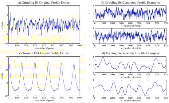 Figure 8 shows examples for generated training profiles. Figure 8a displays the first evaluation area of the profile type Grinding B6 which was utilized for the training data generation. In Figure 8b, two examples for resulting, normalized generated profiles are shown. When a very deterministic profile as the profile Turning E6 in Figure 8c is used, the resulting profiles shown in Figure 8d differ more from the original profile. This is in compliance with the observations made during the model quality estimation in Section 4. The time series models are most accurate for the description of stochastic surface structures.