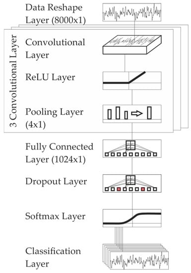 The preprocessed profile data is fed to the first convolutional layer with 16 filters of size 10 × 1, followed by a rectified linear unit (ReLU) Layer and a max-pooling operator with size 4 and a stride 4, which reduces the first-layer data vector to a vector of size 2000 × 1. The 2nd and 3rd layer are structured in a similar way: the 2nd and 3rd convolution is each being followed by a ReLU layer and max-pooling operator, thus the final feature vector size is 125 × 1 (the original data is reduced by 4(nlayers−1) = 16). The combination of convolution, ReLU layer and pooling is expected to preserve important information while reducing the overall data volume, resulting in a reduction of computation time []. The filter sizes are 10 × 1, the number of filters is 32 in the 2nd and 64 in the 3rd layer. The idea behind the constant filter sizes, in combination with the pooling layer is to see local features on the first layer of the CNN and more global features on the third layer of the CNN. The 16 × 125 feature vector is mapped to a 1024 × 1 fully connected layer, which is followed by a dropout layer with 20% dropout probability. The dropout layer is introduced with the idea to prevent overfitting in the model []. A visualization of the architecture is given in Figure 9. After the dropout-layer, a SoftMax layer is introduced for classification, which maps the output of the dropout layer to the range [0, 1].