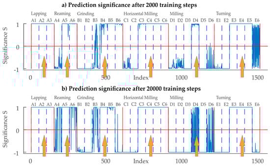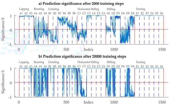 With 2000 training steps, an overall classification rate of 70.13% (mean of classification performance 68.77%) is achieved. This improves to 78.13% (mean of classification performance: 77.61%) when training for 20,000 steps, which hints that after 2000 steps the CNN training process is not yet finished. The classification rate is lower than the 86.88% percent classification achieved with a simulation model for technical surfaces based on a defined PSD function presented in the previous work []. However, in the previous study only two classes—compared to six in the present study—and thus a considerably simpler task were examined. Overall, the classification performance above 70% is more than 4× higher than a naïve (random) estimator which is 1/6 = 16.67%, but can still be subject to improvement. The classification performance varies between the classes (see Table 2 and Figure 10), and with increasing number of training steps (first and 2nd entry in each cell in Table 2). In order to quantify how distinct a classification is, a metric based on the output vector of the SoftMax layer for each sample is introduced. For the prediction significance (shown in Figure 10 and Figure 11) two cases are distinguished: If the input profile is classified correctly, the significance value of the -th recognition is defined as the difference between the maximum of the SoftMax-vector and the 2nd largest value in the SoftMax-vector. Else, if the sample is classified incorrectly, the significance value is defined as the difference between the maximum of the SoftMax-vector and the prediction probability of the true class in the SoftMax-vector. Thus, with the given definition, the prediction significance provides a normalized measure between −1 and 1. A prediction significance of 1 means that the best possible prediction is present. A negative number indicates that the sample is incorrectly classified. An absolute value of close to zero indicates that the classification is ambiguous.