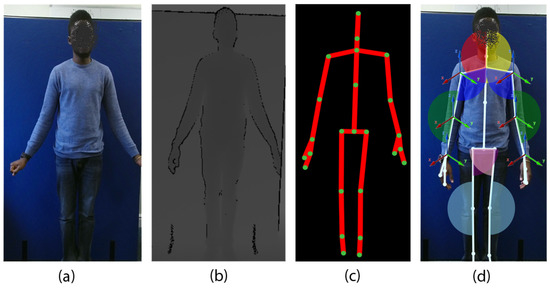 Illustration of depth image transformation: (a) colour stream; (b) depth stream; (c) skeleton (joint are shown in green dots); and (d) tracked skeleton and joints (similar joints are presented with the same colour).