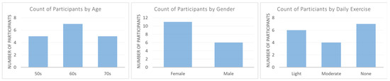 The evaluation of the process was conducted in two parts. Initially some students and staff in the university campus were contacted to take part in the testing of the system. This group of volunteers were not in the right age group and the main purpose of the experiment was to test and evaluate the hardware and software developed for this research. After completion of this preliminary evaluation, in the second phase of the evaluation, 17 volunteers participated in the evaluation and they had the opportunity to interact with the robot platform and follow the recommended exercise. Female and male participants from a relatively wide age group were involved in this study. Figure 7 depicts the distribution of participants based on their age group, gender and their prior daily exercise routine.
