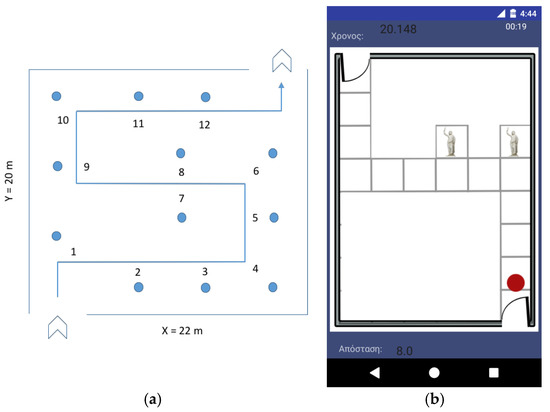 Figure 4a illustrates a typical floor plan of a museum room with an assistive tactile guiding route surface mounted on the floor for autonomous blind navigation/guidance, room dimensions, the positions of the exhibits, as well as the sequence of the exhibits and corresponding vocal presentation during the visit. Similar floor plans of all museum rooms will be designed and integrated with the smartphone application. The lengths of the rectilinear segments of the route are calculated in analogy with the x/y dimensions of the room. Proximity sensors at the exhibits inform the Blind MuseumTourer smartphone application about the current location of the user when an exhibit is approached and vocal presentation follows. The application interoperates with low cost Bluetooth beacons transmitting a small amount of data (the exhibit ID) over a short distance using the Bluetooth low energy (BLE) protocol [72]. The smartphone application receives the beacon signals and determines the user location along the autonomous guidance route. At the same time, besides the discrete-space-estimator beacon-signaled user location, the application continuously performs inertial dead-reckoning calculations, i.e., BVI step counting and corresponding distance calculations as well as heading and turn recognition, using the smartphone accelerometer which, being a continuous space estimator, helps calculate the user trajectory and walked distance and determine the user position in the continuous indoor space. In many cases, a beacon can represent multiple exhibits, for instance exhibits No. 7 and 8 in Figure 4. Figure 4b depicts the corresponding implementation of the concept in an Android activity (see details in Section 4).
