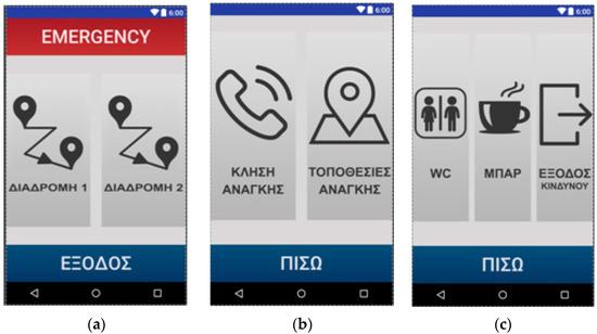 The application functionality is presented in the ensuing. First-time activation by a user will run a configuration activity in which the user should declare some personal details. The main activity will run next, presenting vocally four options to the user, dividing the smartphone touchscreen into four large sections, which can be easily pointed to by the BVI user: “Routes” 1–2, “Help”, and “Back” (Figure 5a). The user interacts with the application either through a single tap for hearing a selection, a double tap for confirming a selection, or through voice. Selecting a route initiates the self-guided tour activity (Figure 5b). This activity handles the dynamic navigation inside the museum rooms in real-time, determines the user location during the self-guided tour and presents the exhibits approached by the user along the tour route. The help option available anytime allows the user to talk/find the way to the help desk (Figure 5c), or find the way to the restroom, to the canteen/cafeteria, or to the exit (Figure 5d), following the voice navigation instructions. Depending on the number of options offered by the application’s activity screens, the smartphone touchscreen is divided into respective sections (Figure 5c presents a bottom “back” touch section and left and right areas in the rest of the touchscreen; Figure 5d divides the major touchscreen into three vertical areas corresponding to the three available options). Figure 6 depicts indicative summary floor plans with exhibition routes at the National Archaeological Museum and at the Acropolis Museum. The Blind MuseumTourer application integrates an indoor positioning system using beacons and unobtrusive tactile route indicators on the floor, enhanced with inertial dead-reckoning functionality to improve navigation accuracy and reliability, according to the principles presented in Section 4.2.