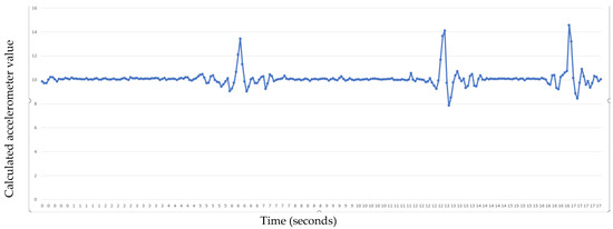Calculated sum of squared values of accelerometer sensor coordinates (value = x2 + y2 + z2) over time during three steps (represented by the graph peaks) with short rests in between. Sampling rate is five samples per second. Step pace and average step length over route sectors of known distance can be trivially calculated.