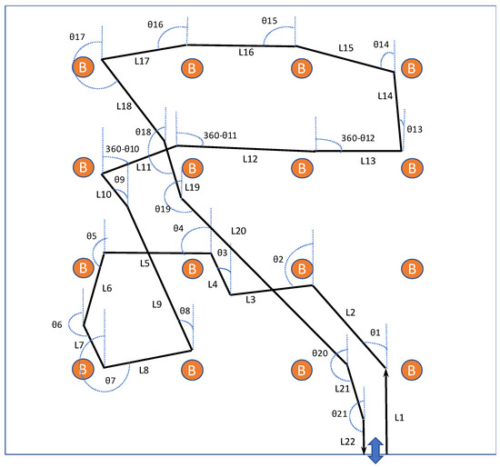 The application further monitors the user turns to verify whether the user has acted according to the turn instructions. This mechanism relies on sensor fusion using the accelerometer and a rotation vector. Sensor fusion reports azimuth, pitch and roll values, with the first two values used to detect the user turn. Finally, using the smartphone magnetometer sensor, the integrated inertial dead-reckoning mechanism detects in real time the user heading through the relative orientation of the user device relative to the Earth’s magnetic north. Figure 8 is a schematic depiction of the tracking capability of our hybrid indoor positioning mechanism relying on inertial dead reckoning and exploiting BLE beacons deployed in the indoor environment. Assuming the generic problem of BVI free travel inside the indoor environment, the developed location tracking mechanism can determine the motion trajectory of the BVI and represent it as a sequence of rectilinear segments, simulating very close to reality how blind and visually impaired persons walk. The lengths of the rectilinear segments are estimated using the integrated accelerometer, as explained, while their orientations, shown exemplarily in the figure relatively to the y-axis, can be determined using the integrated magnetometer. Magnetic north is assumed in the direction of the y-axis. In order to enhance the accuracy and reliability of the inertial dead reckoning positioning mechanism, beacons can be exploited for the verification and adjustment of the continuous real-time calculations and dynamic parameter valuation and continuous calibration of the tracking mechanism during the execution of the indoor navigation application.