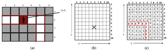 Indoor tiles map: (a) Example of current user position on the assistive tactile path calculated in real time; (b) Example room tile map with user position at point (6, 7); (c) Room tile map illustrating the user position on the highlighted assistive tactile navigation path.