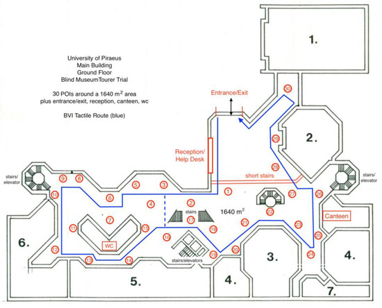 Successful tests of the presented system were performed with three blindfolded sighted users in the ground floor area of the University of Piraeus’ main building (Figure 12). The users were given a Blind MuseumTourer smartphone and a cane at the entrance of the building. Guidelines on how to use the application and the surface mounted indicators were provided by the trial staff and the blindfolded users were left to navigate around the 1640 m2 space following a predetermined tour between several POIs (30 POIs representing museum exhibits plus another four POIs: entrance/exit, reception/helpdesk, canteen/cafeteria and rest room) guided by the Blind MuseumTourer smartphone application. During the tour, the users were also able to interrupt the tour anytime asking the application to guide them to a specific place (any of the four non-exhibit POIs) and subsequently either resume the tour from the interruption point or move to the exit. Two shortcuts available in the tour ring (between POIs No. 3 and 16, as well as across the short stairs) can be exploited by the application to shorten the path to the requested POI in that case. At the end of this experience, when the blindfolded users had reached the exit, they were asked to evaluate three critical factors of the indoor navigation application: reliability, instruction efficiency and ease of use. All users gave excellent grades in all aspects. Besides the important subjective evaluation, the trial additionally evaluated the inertial dead reckoning localization error per path segment between successive POIs.